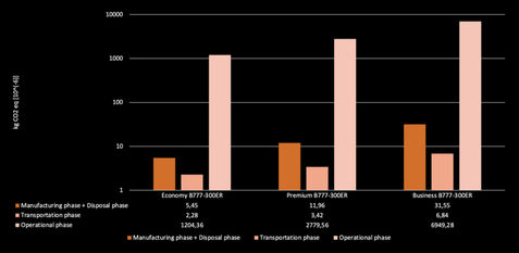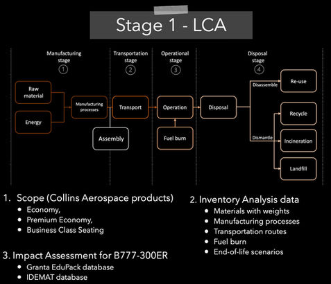 To generate accurate results, we extracted data from thousands of engineering drawings of seating assemblies, cataloguing material compositions, weights, and manufacturing details across classes. These inputs fed into an Excel-based model referencing verified databases such as Granta EduPack and IDEMAT. Each life cycle stage—manufacturing, transport, operation, and end‑of‑life—was characterised using kg CO₂ equivalent impacts, visualised in a comparative bar chart showing phase contributions for different seat categories. Even small design differences revealed measurable performance gaps once scaled to the fleet level. I designed this systematic approach to ensure that Collins could trace environmental hotspots not only across materials but also across cabin configurations.